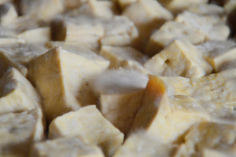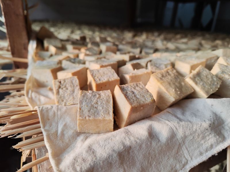 洁白扎实的豆腐在切块风干后,被整齐地摆在稻草编织的席子上,这便是“罗大姐豆腐乳”的第二层味儿——随着时间的推移,豆腐在发酵的同时,会吸收稻草的清香,而稻草中特有的微生物群,也会帮助豆腐发酵。