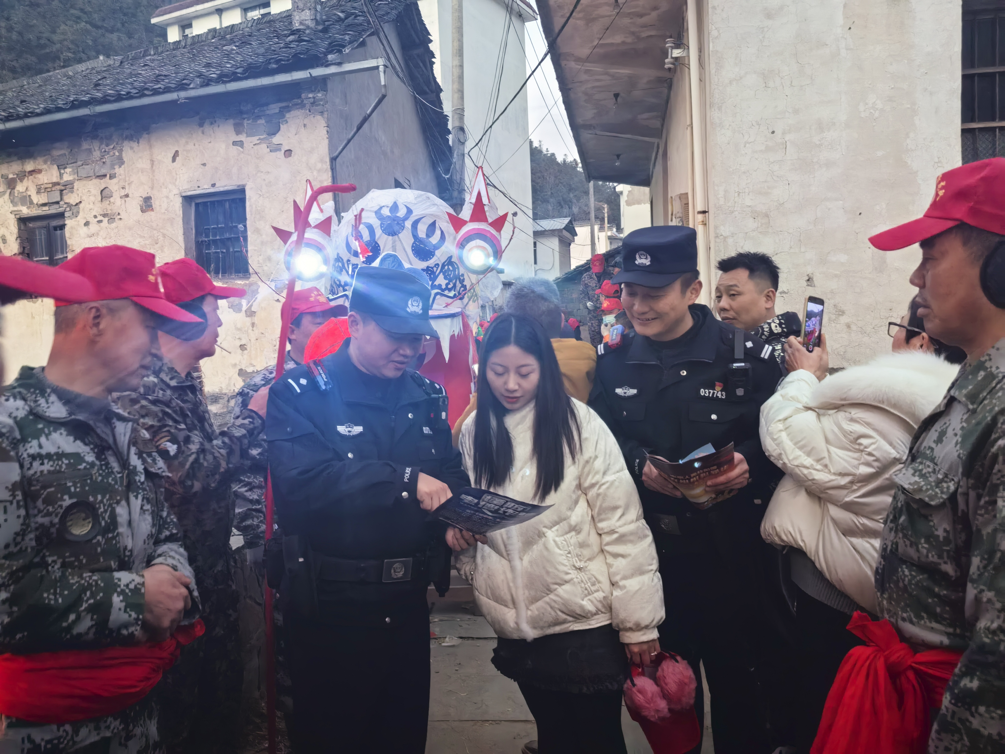 百米龙灯蜿蜒游街,数千群众簇拥喝彩。这个春节,在休宁县流口镇,伴随着新春佳节“游龙”舞上街头,一支直藏蓝身影也不时穿梭在人群里,将一份份沉甸甸的平安"年货"送到百姓手中。