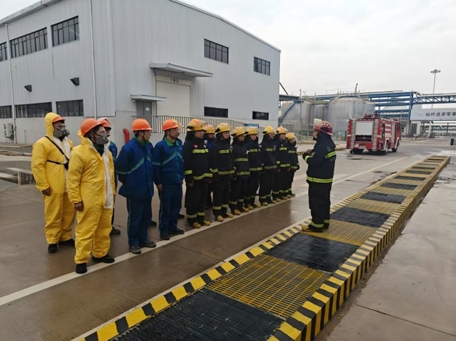 演练前,全体消防员在企业负责人的带领下对厂区的建筑结构、罐区储存、重点部位、消防逃生通道、危化品种类和消防设施等情况进行了详细熟悉。随后,设定乙醇储罐因工人操作不当引发火灾,火势猛烈,情况十分危急。“接警”后,新源浩科企业专职消防队开展火灾初期处置,姚家港消防救援站3车16人赶赴现场进行处置。到场后,根据现场情况,指挥员立即命令出两支水枪、架设一具水炮对着火装置进行全方位打击,举高喷射消防车对着火罐体及周边罐体进行灌顶漫流、灭火机器人对罐体进行冷却,其余人员做好救援准备、外围警戒及后场供水。经过20分钟的紧张“处置”,大火被成功扑灭,此次演练圆满结束。
