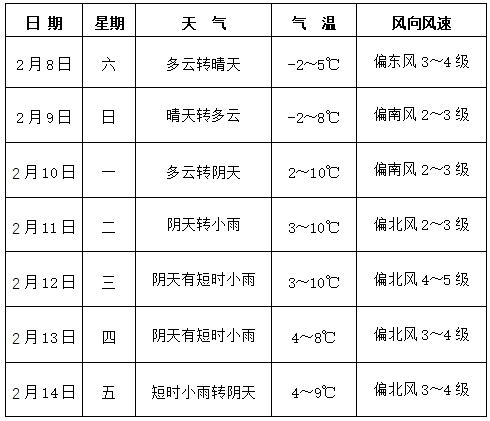 未来一周(2月8-14日)我市前晴后雨,有连续阴雨天气,低温前期较低,后期回升。其中11日至14日以阴天为主,部分时段有小雨;12日风力有所加大,有偏北风4~5级,阵风6~8级。