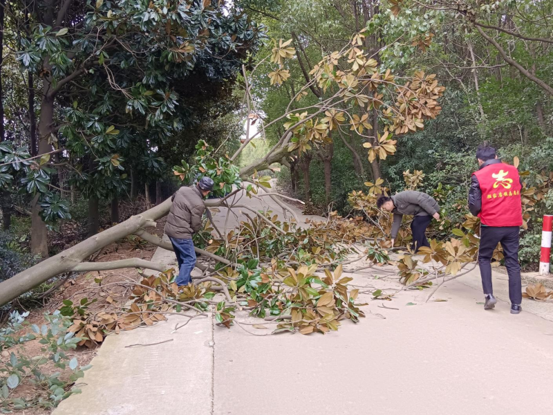 为了尽快排除隐患,畅通道路,村民们有序分工展开清理。有的村民负责统筹协调,疏散周边围观群众并引导过往车辆选择临时路线,有的对树木进行切锯搬离,清扫枯枝落叶,及时消除安全隐患。