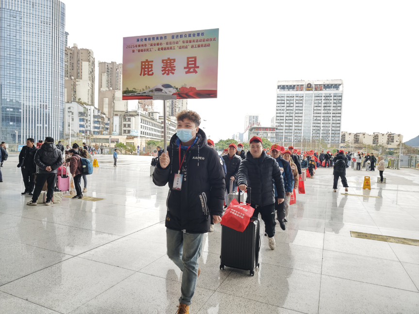 为深入贯彻习近平总书记关于高质量充分就业的重要论述,有效推动农村劳动力转移就业,2月7日,鹿寨县举行2025年农民工返岗复工“点对点”送工服务活动,欢送来自8个乡镇的86名农民工(含5名脱贫劳动力)赴粤就业。