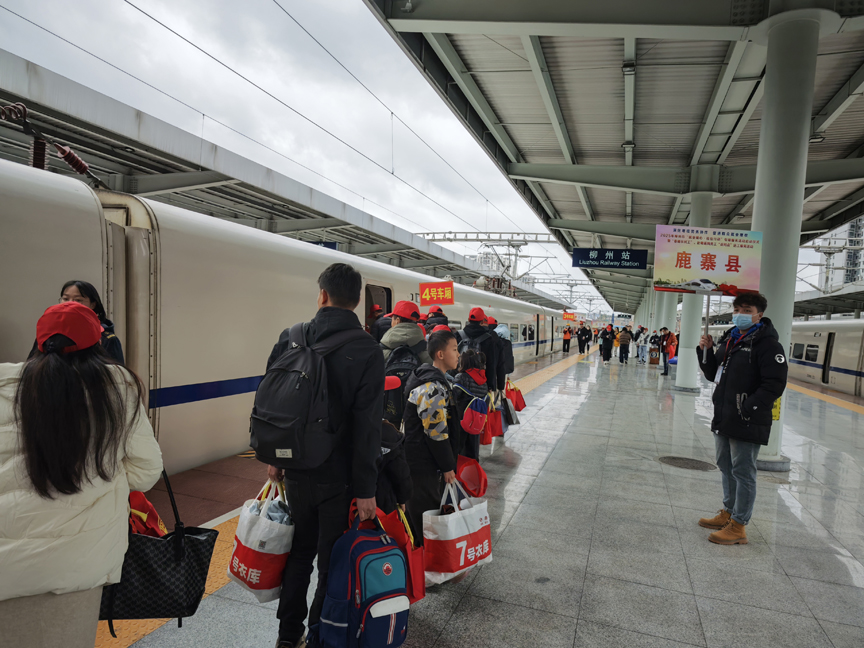 当天,为保障顺利出行,鹿寨县安排8辆专车帮助农民工踏上返岗增收的道路。带着对新一年的憧憬,返岗农民工在鹿寨县艺术中心集合并搭上专车,前往柳州站乘坐赴粤返岗务工专列动车,开启新的奋斗征程。