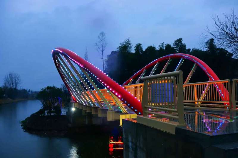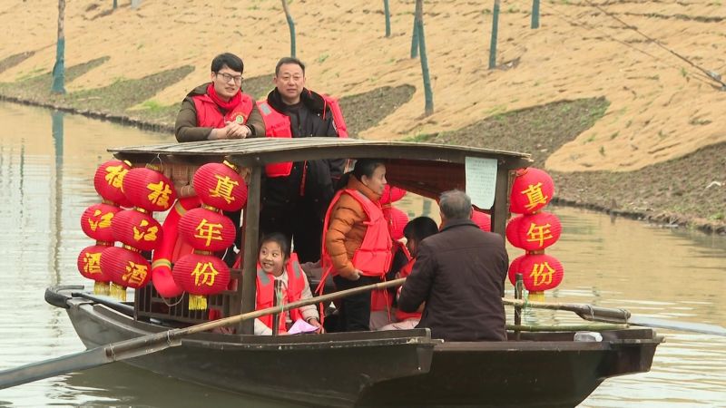 2月6日,在位于董市镇平湖村的云盘湖湿地公园内,新增的乌篷船乘坐体验项目吸引了不少游客。坐在乌篷船上,观看精彩的水上表演,两岸草坪即将泛绿,河道流水潺潺,仿佛置身江南水乡一般。公园内新建的3D声光玻璃桥“彩蝶桥”也成为了新晋网红打卡地,每当夜幕降临,桥上灯光亮起,氛围感十足。