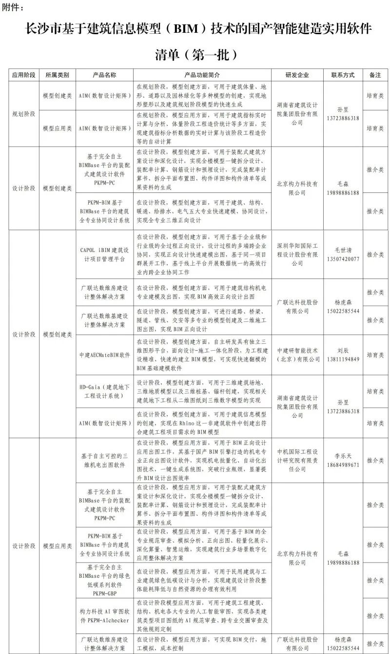 近日,《长沙市基于建筑信息模型(BIM)技术的国产智能建造实用软件清单(第一批)》发布,包括“基于自主可控BIM的装配式建筑设计协同管控集成系统”等13项推介类软件以及“中建AECMateBIM软件”等3项培育类软件。该清单旨在推动国产自主可控的BIM技术在智能建造领域的广泛应用,提升建筑全生命周期的数字化、智能化水平,助力打造智能建造“长沙模式”,推动建筑业高质量发展。