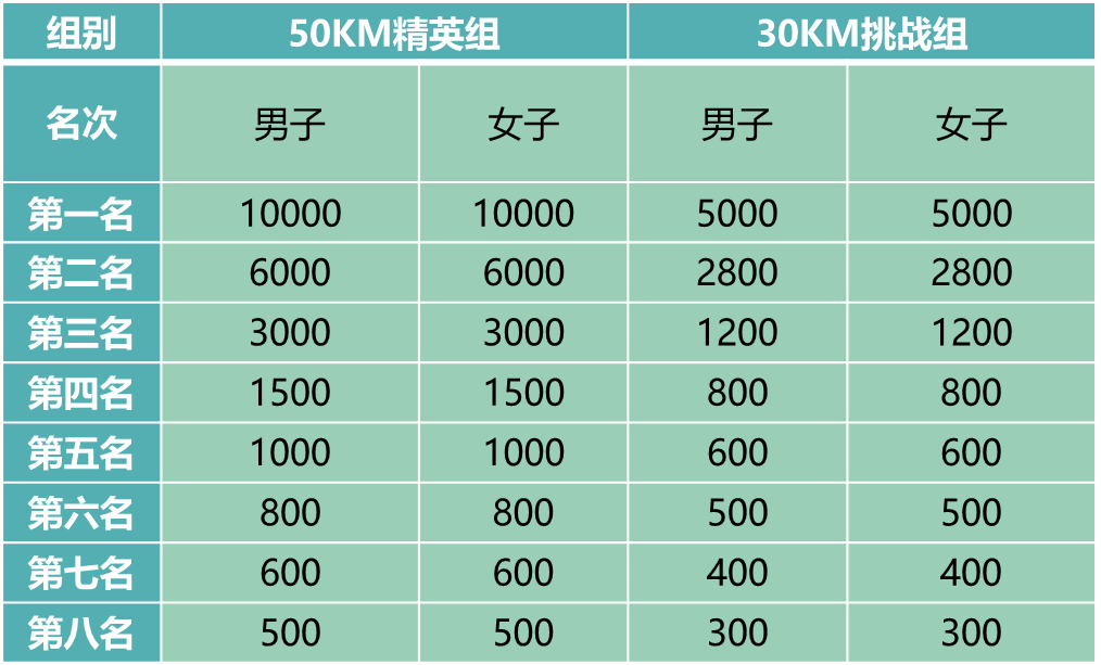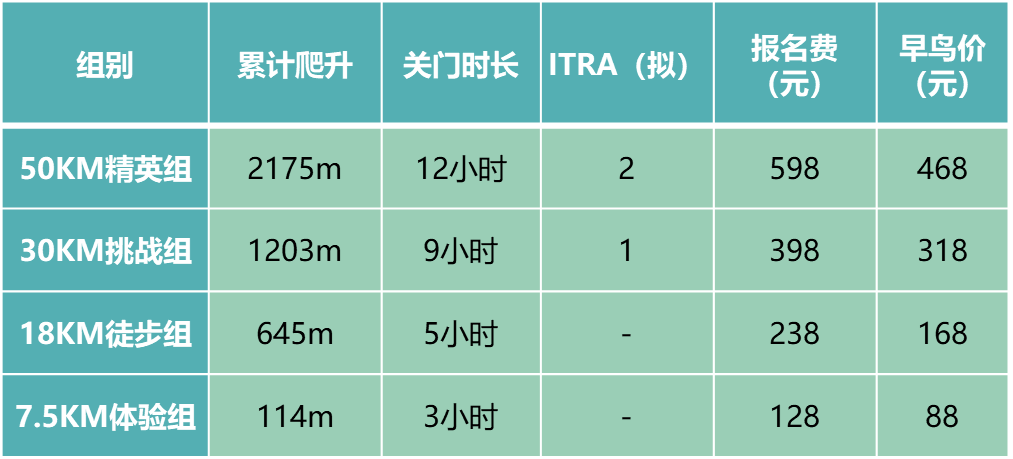 项目组别:50KM精英组、30KM挑战组、18KM徒步组、7.5KM体验组