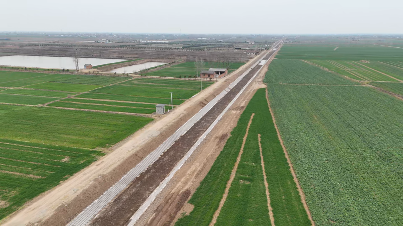 在灌区的田间地头,一条条崭新的沟渠犹如大地的静脉,在阳光下构建起庞大的输水 “脉络”。