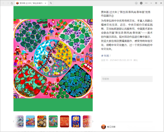 线上展示别开生面,足不出户品赏年画。为了让更多市民参与到活动中来,枝江市新时代文明实践中心推出2期线上年画展示,通过枝江文旅微信公众号、云上枝江等平台,展示200余幅精美年画,让市民足不出户也能欣赏到年画艺术,感受传统文化的熏陶。
