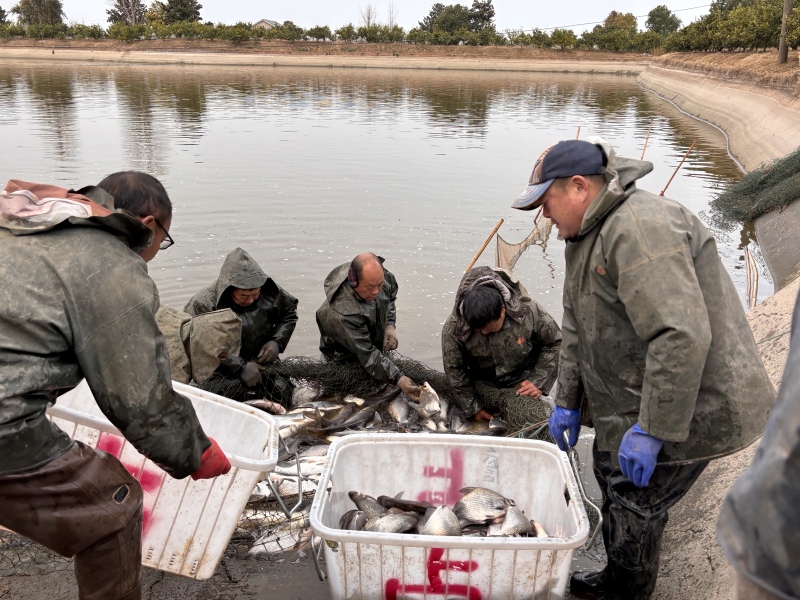 枝江市共发水产合作社理事长詹桅明:“我们今天捕捞的是一些常规品种,鳊鱼和白鲢,主要销往荆州,因为我们合作社跟荆州市场有长期的合作协议,今天差不多有一万二、三千斤。”