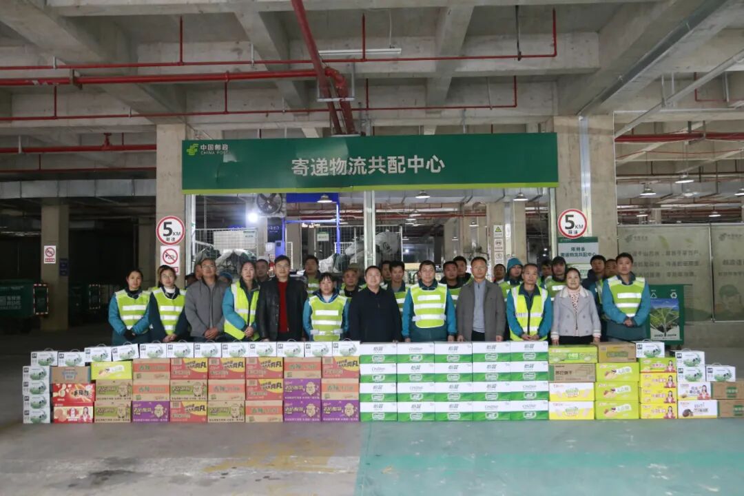 上午9时,慰问组抵达邮政物流分拨中心,现场堆积如山的包裹见证着邮递工作人员的忙碌。慰问组为他们送慰问品,感谢他们在节日期间依然保障邮政物流的畅通,让千家万户能及时收到期待的快递包裹。