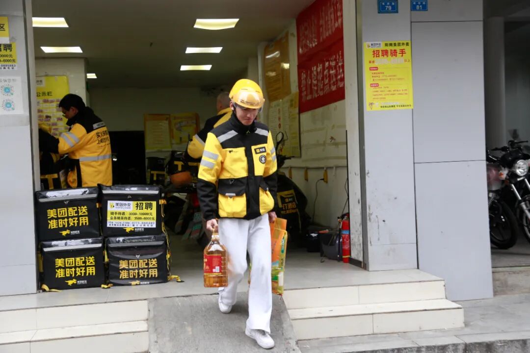 10点整,慰问组到达美团外卖配送站。外卖小哥们陆续返回站点,稍作休息后又要奔赴下一单。慰问组为他们送上大米、食用油等慰问品,对他们风雨无阻、穿梭大街小巷为市民提供生活便利表示感谢,希望他们在新的一年送餐途中注意交通安全,文明骑行。