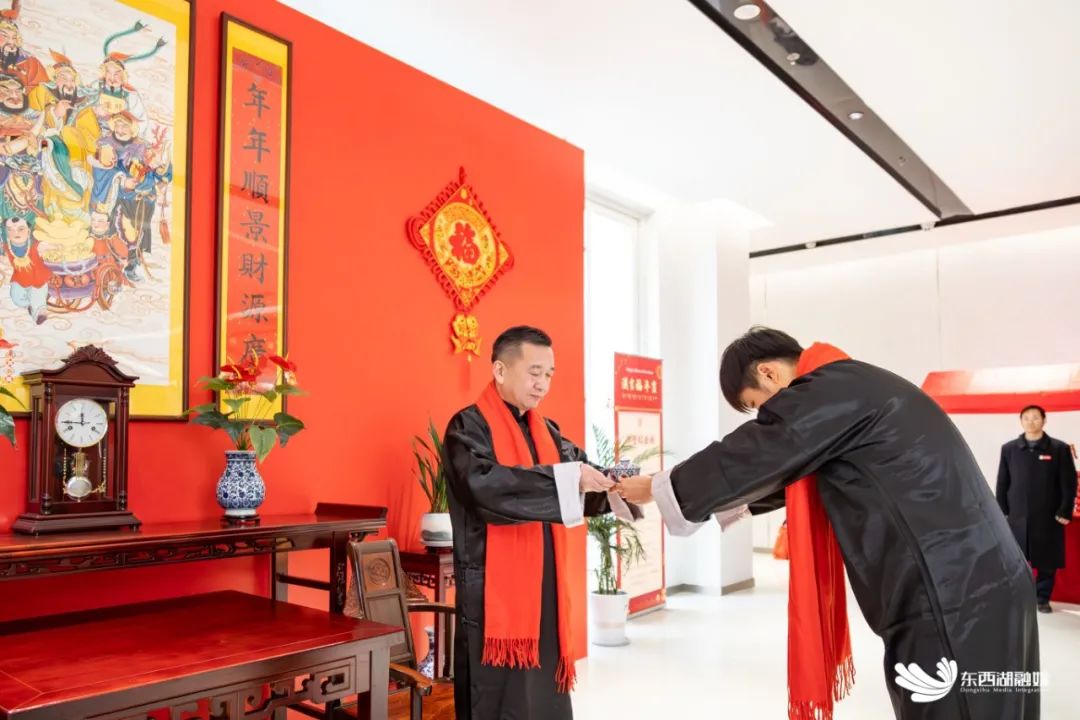 传承人李嘉鸿站在一旁,年轻的眼眸里闪烁着对柏泉古井传说传承的热忱与坚定。拜师仪式正式开始,李嘉鸿脚步轻缓却坚定地来到柏泉古井传说传承大师熊仁强面前,庄重地行拜师礼。他微微俯身,深深鞠躬,表达对师傅的敬重;随后,双手恭敬地捧起斟满香茗的茶杯,递向熊仁强,眼神中满是敬重与虔诚。