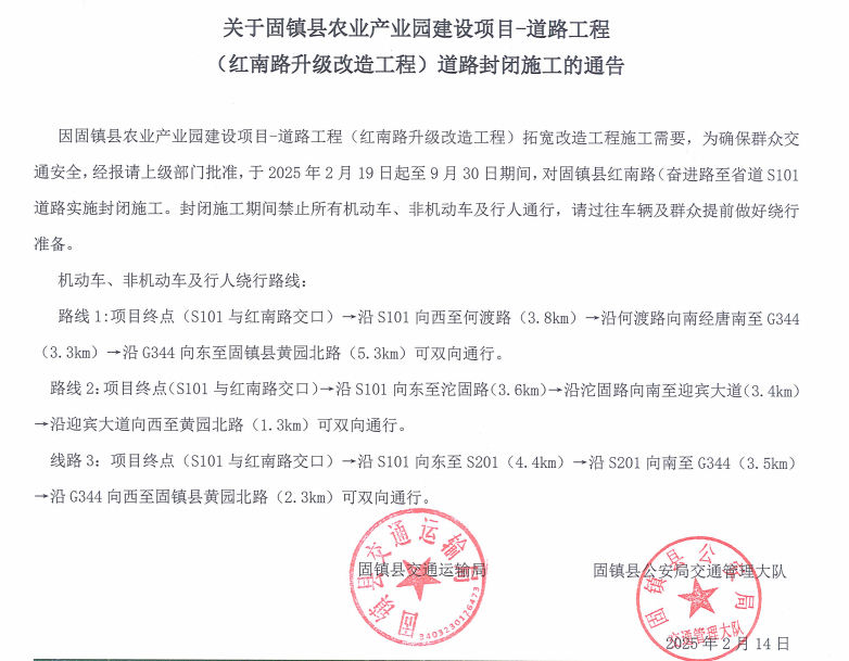 关于固镇县农业产业园建设项目-道路工程(红南路升级改造工程)道路封闭施工的通告