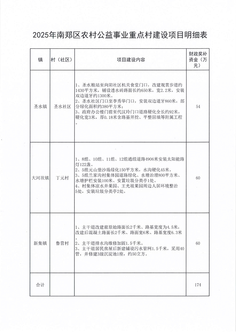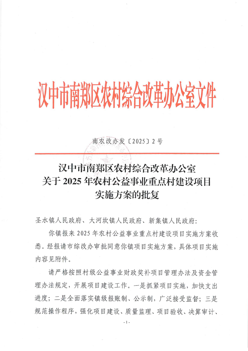 汉中市南郑区农村综合改革办公室关于2025年农村公益事业重点村建设项目实施方案的批复