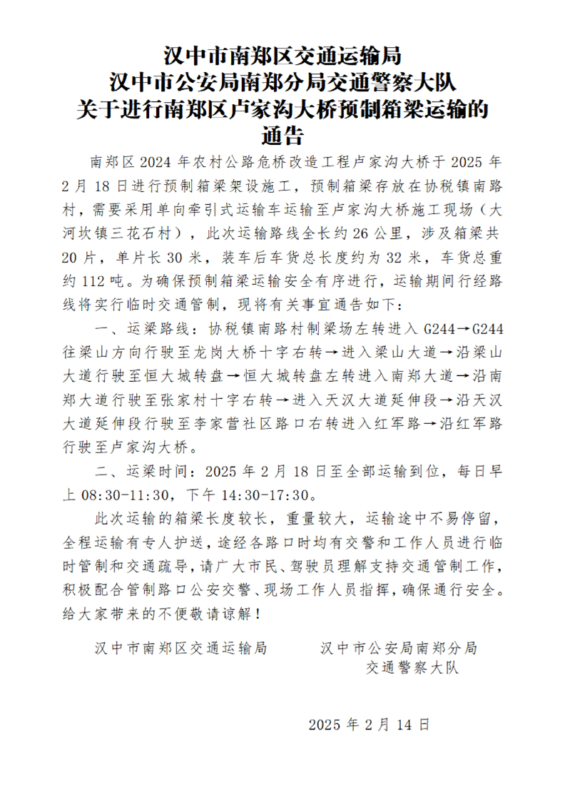 汉中市南郑区交通运输局汉中市公安局南郑分局交通警察大队关于进行南郑区卢家沟大桥预制箱梁运输的通告