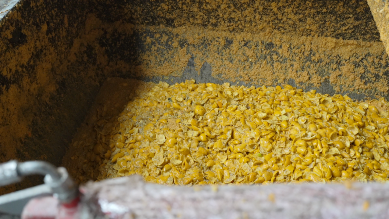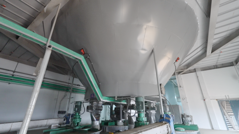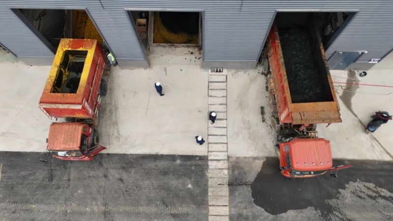 与李莉交谈之余,两辆满载果渣和果胶泥的卡车缓缓驶入。这些果蔬废弃物来自当地柑橘加工企业,经过密闭专用车辆运输至厂区后,被分别卸入两个不同的投料斗。