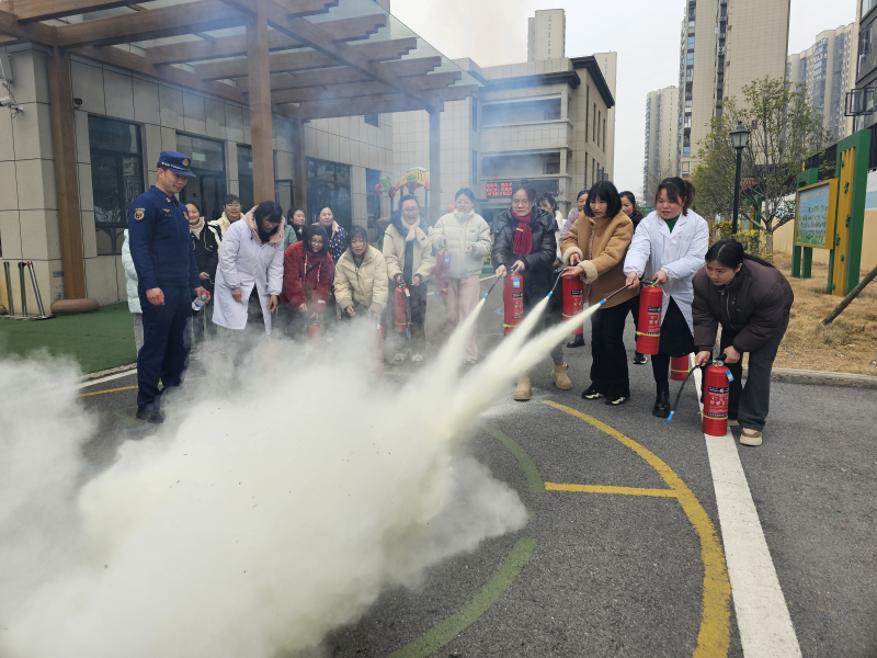 在操场的空旷处,消防宣传员组织幼儿园老师和职工开展了油盆灭火演练。消防宣传员详细讲解了灭火器的使用步骤和注意事项,老师们和职工们全神贯注,认真聆听每一个要点。实操环节,大家跃跃欲试,在消防宣传员的指导下,提起灭火器快步冲向火源,拔掉保险销,对准火焰根部按压把手。瞬间,熊熊火焰迅速被扑灭。