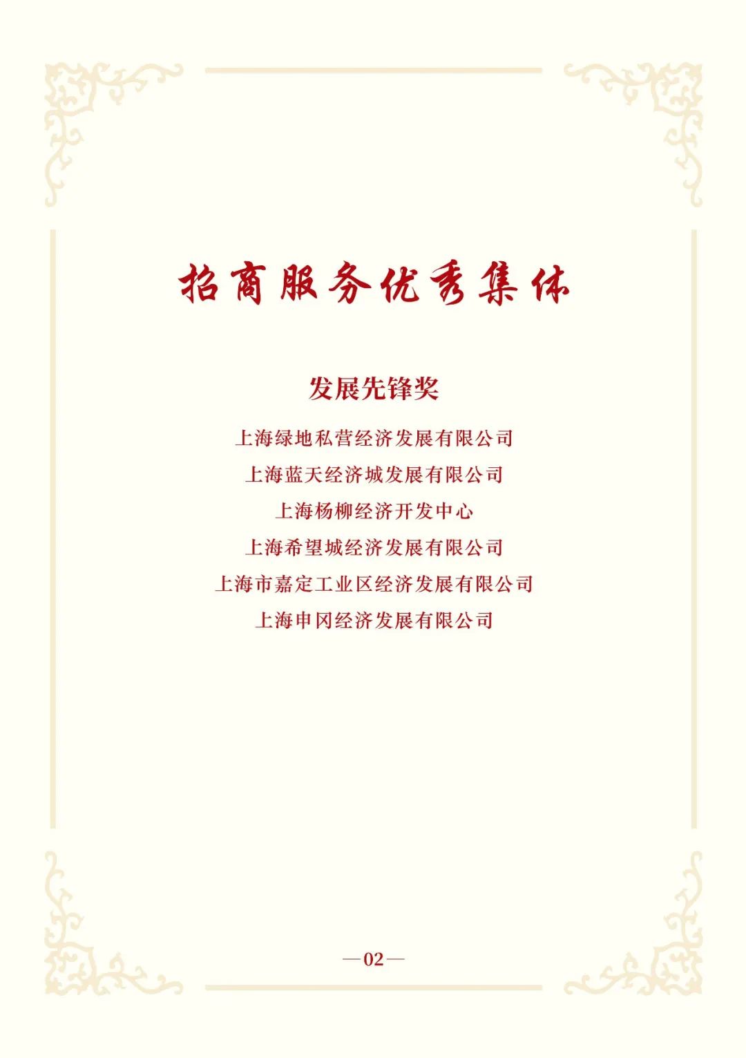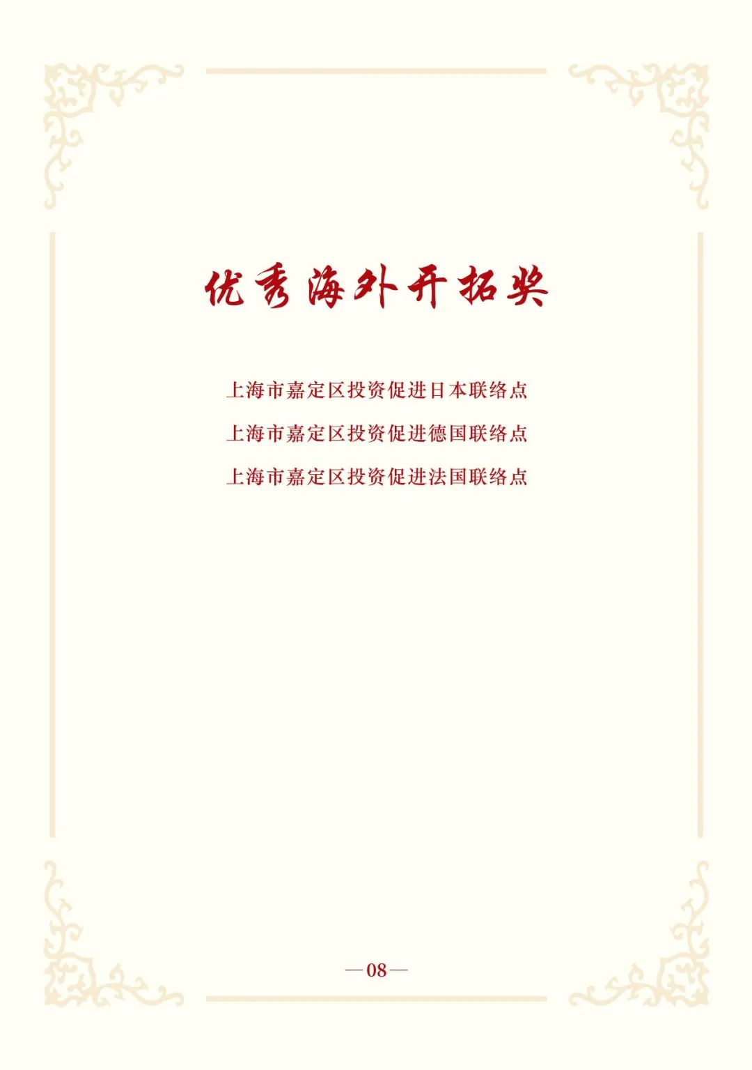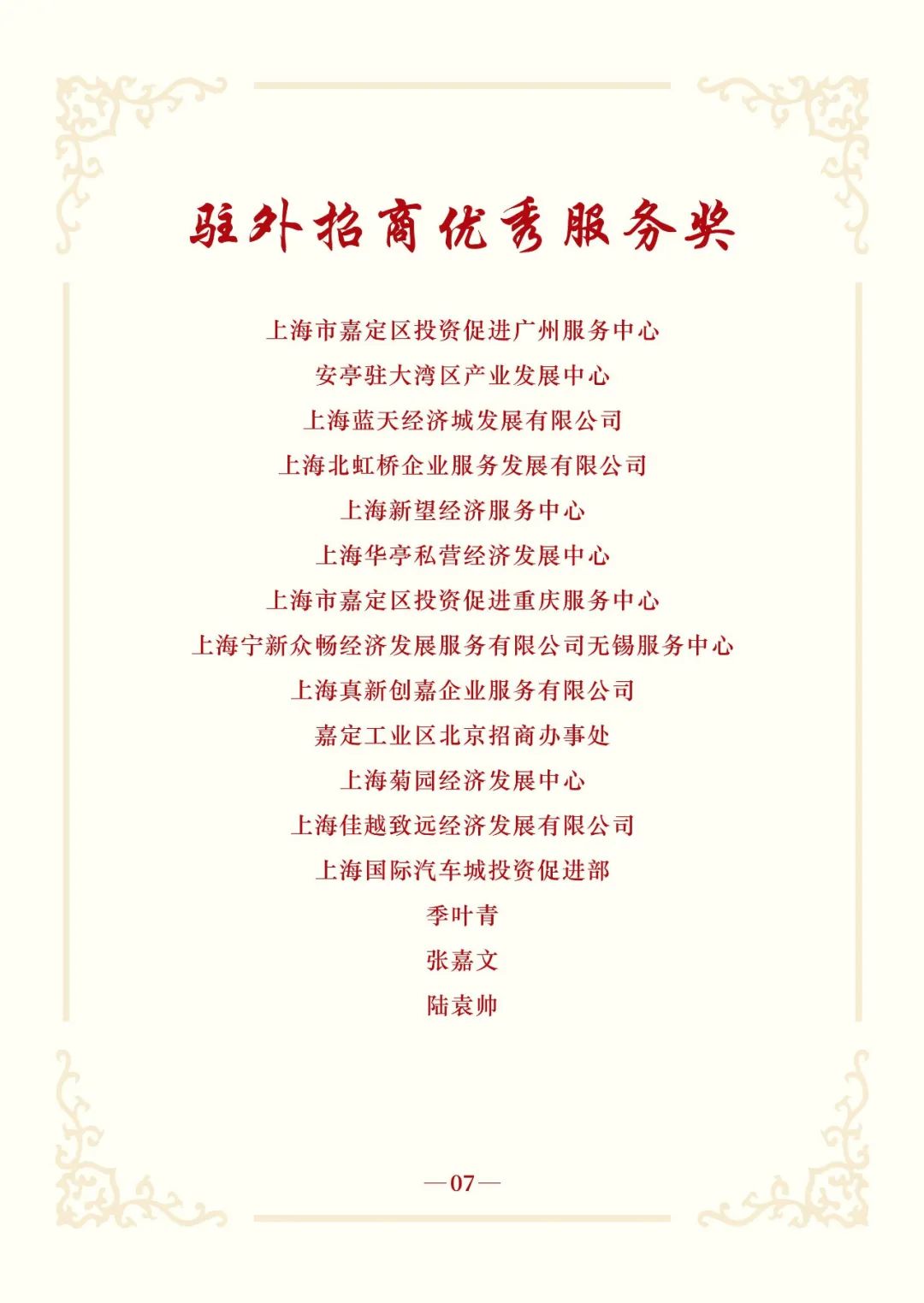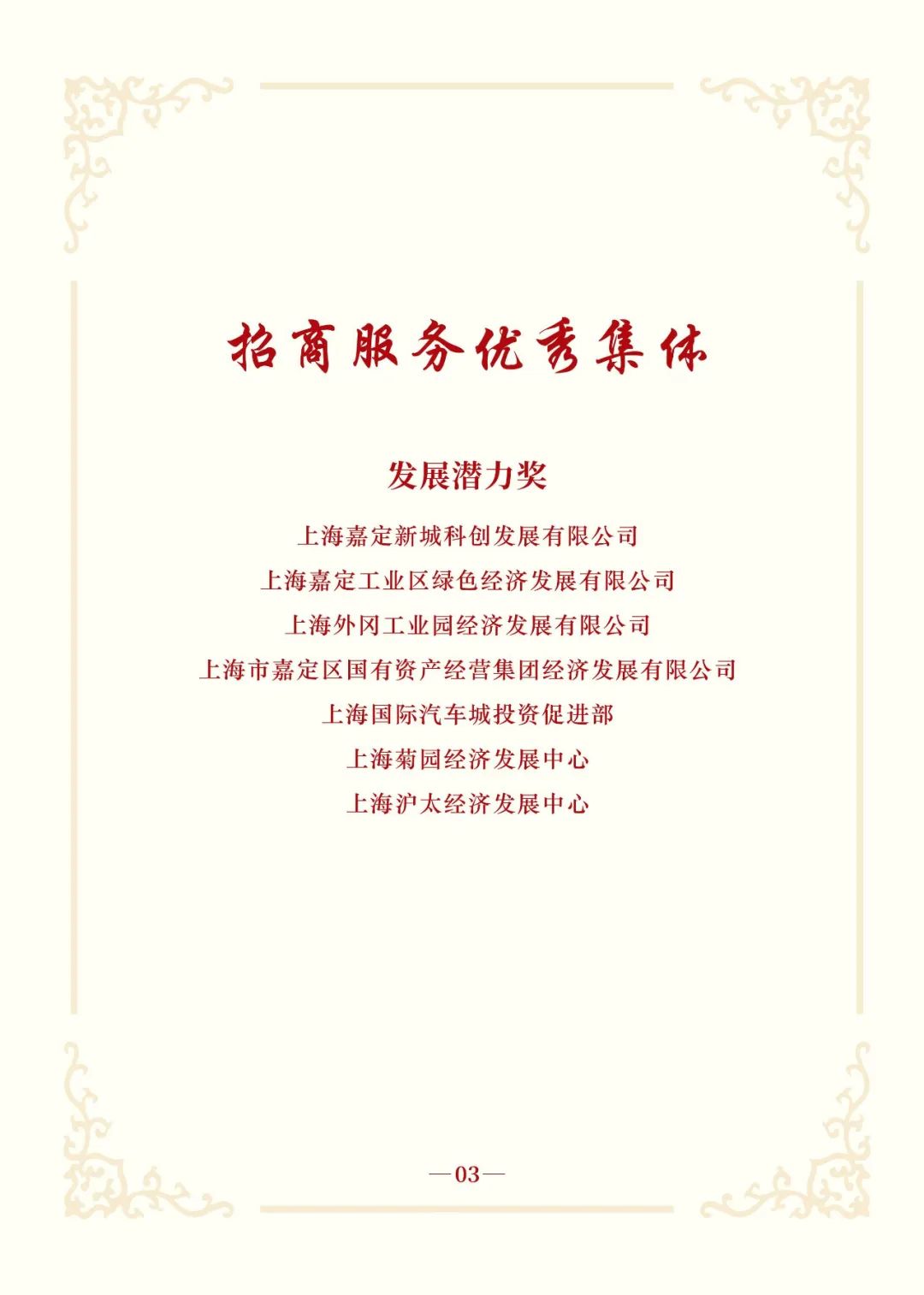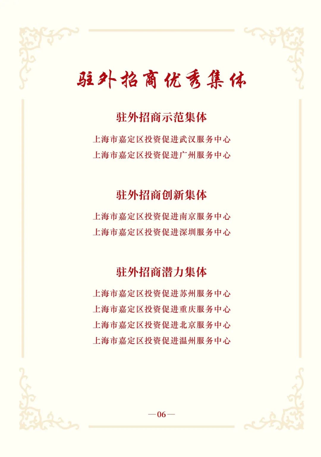 会上,上海大众经济城发展中心等16家集体荣获“2024年度嘉定区招商服务优秀集体”;杨丽萍等50人荣获“2024年度嘉定区招商服务优秀个人”;上海市嘉定区投资促进武汉服务中心等8个服务中心荣获“2024年度嘉定区驻外招商优秀集体”;上海市嘉定区投资促进日本联络点等3个联络点荣获“2024年度嘉定区优秀海外开拓奖”;上海市嘉定区投资促进广州服务中心等13个集体和季叶青等3人荣获“2024年度嘉定区驻外招商优秀服务奖”。联影医疗、上汽恒旭、仲量联行、中国传感器及物联网联盟等16家2025年新一批全球战略合作伙伴授牌。嘉定工业区、区商务委、汽车城集团和上海械谷4家单位围绕各自领域作交流发言。