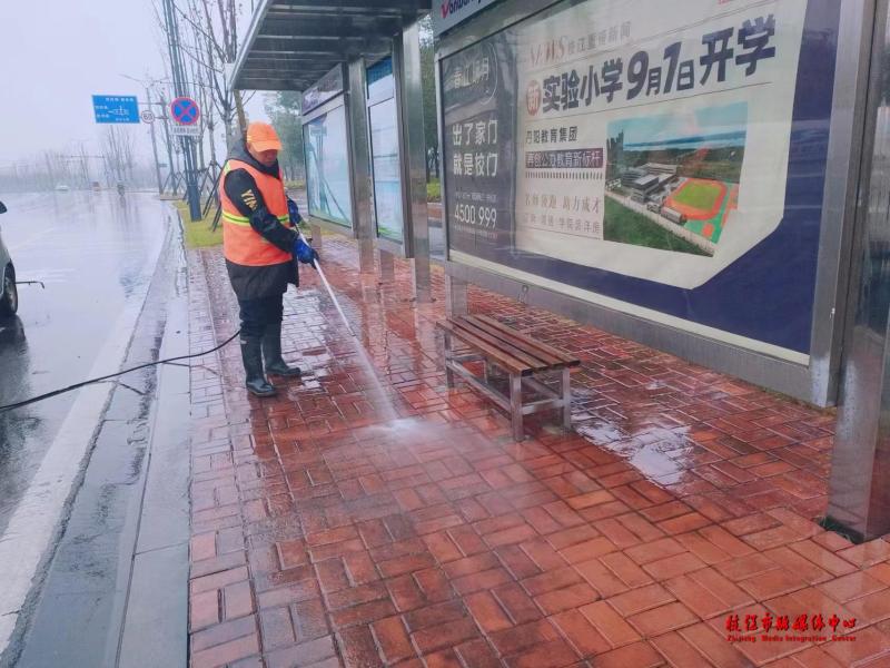 行动中,利用雨水对路面污垢的浸泡软化作用,环卫工人手持高压水枪,配合雨水冲刷路边缝隙对主次干道、公交站台、果皮箱等进行深度清洁,原本顽固附着在砖缝中的烟头、砂石,在雨水浸润下变得松软,经水枪精准冲洗后随水流汇入排水口。还有的工人身着雨衣,手持扫帚、抹布,冒雨仔细清理路边的泥沙、落叶以及卫生死角,不放过任何一个细节。