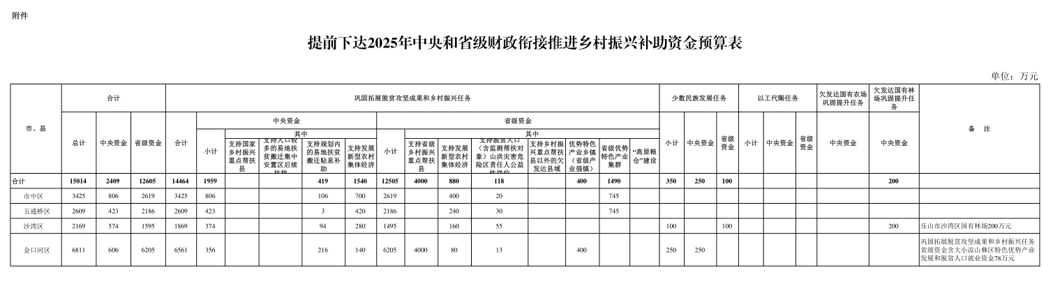 根据《乐山市财政局 乐山市农业农村局 乐山市民族宗教事务委员会 乐山市林业和园林局关于提前下达2025年中央和省级财政衔接推进乡村振兴补助资金预算的通知 》(乐市财政农〔2024〕83号)精神,现提前下达你们单位2025年中央和省级财政衔接推进乡村振兴补助资金预算指标6811万元(详见附件)。该项指支出功能科目“21305599--其他巩固脱贫攻坚成果衔接乡村振兴支出”。现就有关事项通知如下: