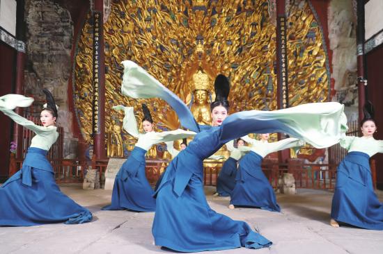 3月24日,舞蹈诗剧《只此青绿》主创团队在大足石刻宝顶景区拍照打卡,为千年大足石刻增添了别样的韵味。