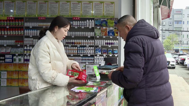 走进董市镇的一家农资经营店,店铺内整齐地摆放着各类农药、化肥和种子,不时有农户前来购买农资。