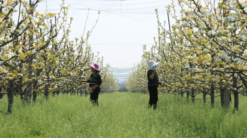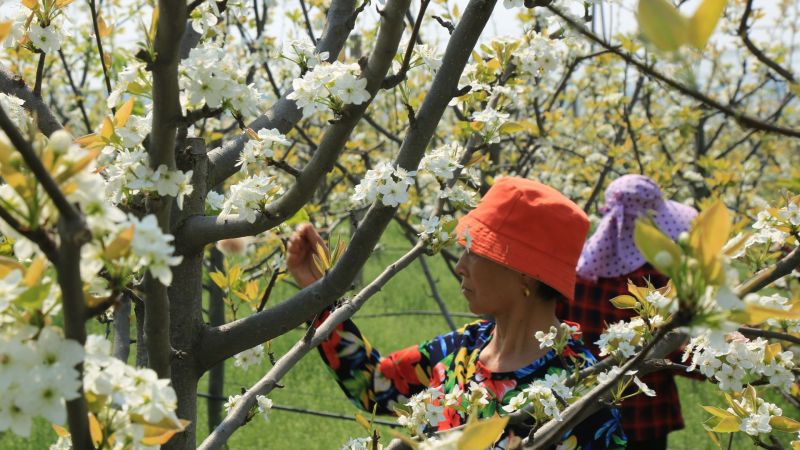3月26日,在百里洲镇沿江村红新果蔬专业合作社的梨园里,果农们手持特制授粉工具,穿梭于梨树间,小心翼翼地将花粉点涂在梨花柱头上。