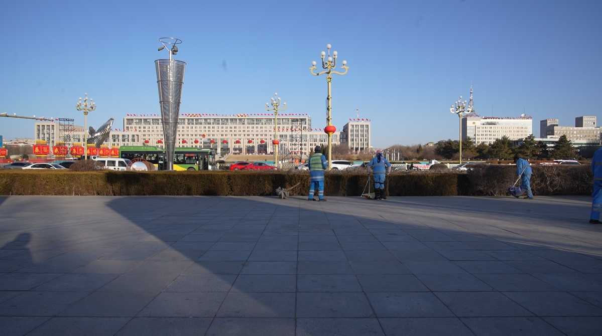 除了机械清扫外,人工清扫也是环卫清洁工作的重要一环。在玉龙大街市政府南广场,记者看到赤峰京环环境服务有限公司的环卫工人们正在认真清扫路面,他们动作利落细致,不一会儿就把路面打扫得干干净净。
