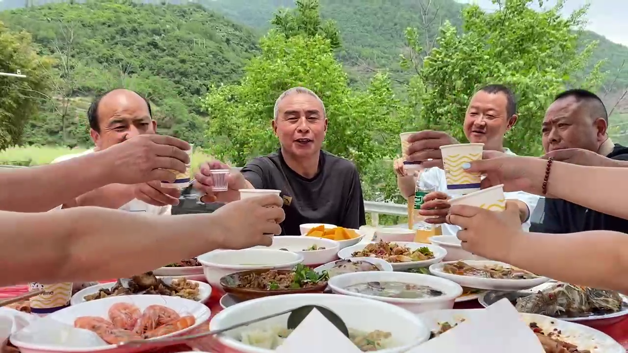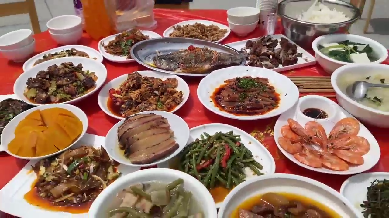 中午饭点,十张圆桌整齐排布,满满当当的美食述说着村民的欢欣。粉蒸排骨、野菜腊肉等十多道农家菜香气四溢,引得众人翘首以盼。
