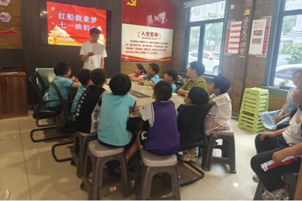 活动伊始,党群服务站的工作人员化身“红色故事讲解员”,用生动有趣、通俗易懂的语言,为孩子们讲述红船故事。从1921年嘉兴南湖上那艘小小的红船,到中国共产党如何承载着人民的重托、民族的希望,越过急流险滩,穿过惊涛骇浪,成为领航中国行稳致远的巍巍巨轮,一个个细节在讲解中变得鲜活起来。孩子们围坐在一起,眼神中满是专注与好奇,被那段波澜壮阔的历史深深吸引。