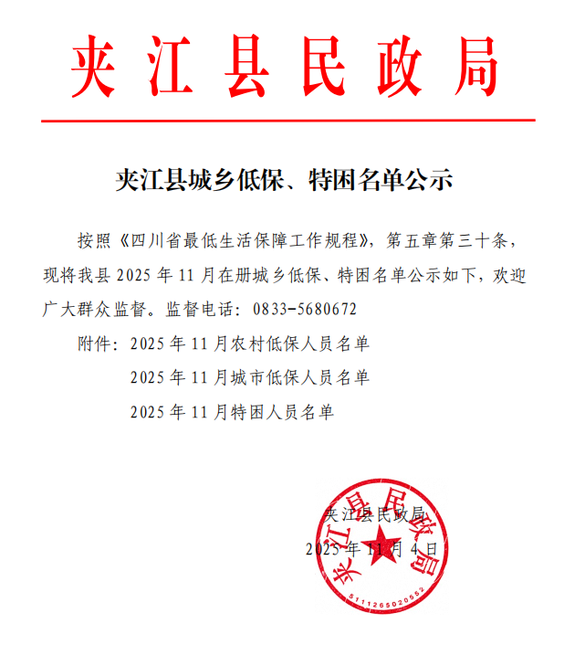 2025年11月夹江县城乡低保、特困名单公示