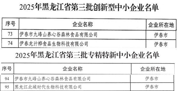 近日,2025年黑龙江省第三批次省级创新型及专精特新中小企业认定名单公布。我市九峰山森林食品、龙汁桦食品2家企业荣获省级创新型中小企业称号,九峰山森林食品、北域时代生物科技2家企业荣获省级专精特新中小企业称号。