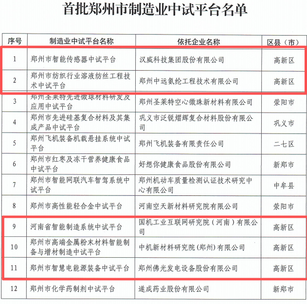 今日从郑州高新区经济发展部传来好消息!经企业申报、区县(市)推荐、专家评审、网上公示等程序,郑州市工信局认定12家中试平台为郑州市首批制造业中试平台。郑州高新区共有5家中试平台入选,占全市总数的41.6%,数量位居全市首位。