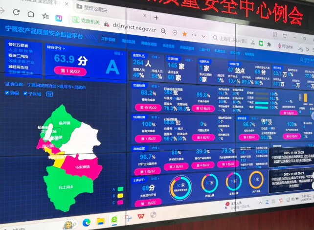 在市农产品质量安全中心可以看到,宁夏农产品质量安全监管平台清晰呈现定量检测、快速检测、准出监管等多维度数据。工作人员正在对我市农产品质量安全状况进行智慧化监管,借助该平台的网格巡检、风险监测等功能,实现农产品质量安全全流程、数字化把控。