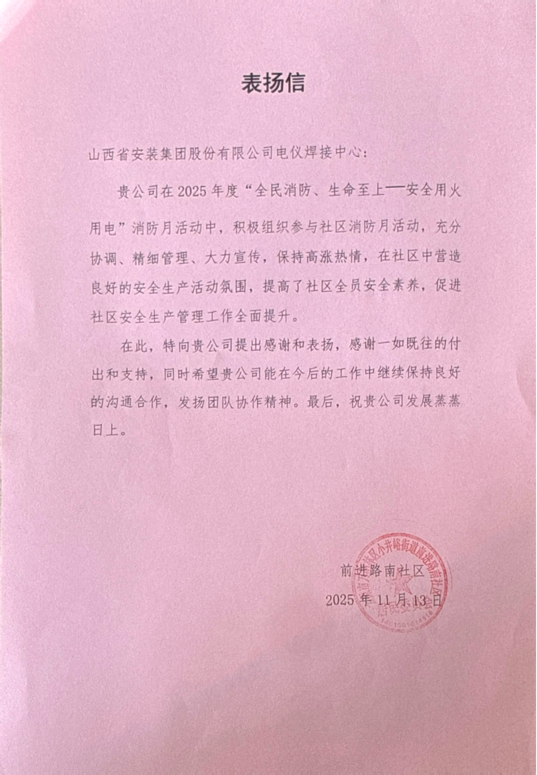 11月13日,电仪焊接中心收到太原市万柏林区前进路南社区发来的表扬信,对中心参与2025年度“全民消防、生命至上——安全用火用电”消防月活动的工作给予肯定,这是社区的认可,更是一份责任。
