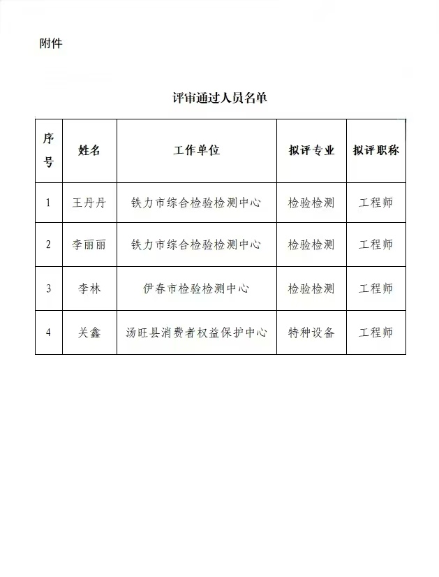 伊春市2025年度市场监督工程系列中级专业技术职务任职资格评审委员会评审通过人员公示
