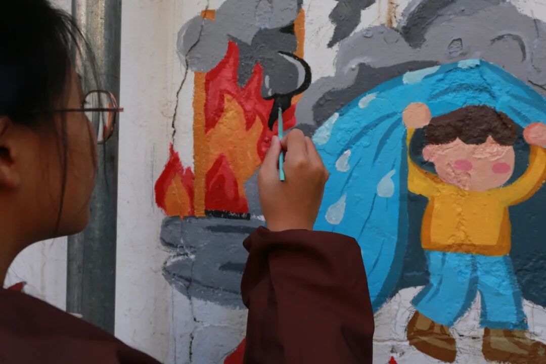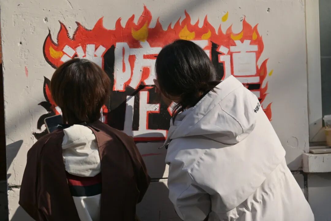活动现场,同学们调配颜料、挥动画笔,从线条勾勒到色彩填充,一步步将单调墙面变身“消防科普长廊”。人气IP“蹈火哪吒”帅气亮相,灭火器正确用法、火灾逃生攻略等实用内容以生动漫画形式呈现,既好看又好记,引得居民纷纷围观、连连点赞。