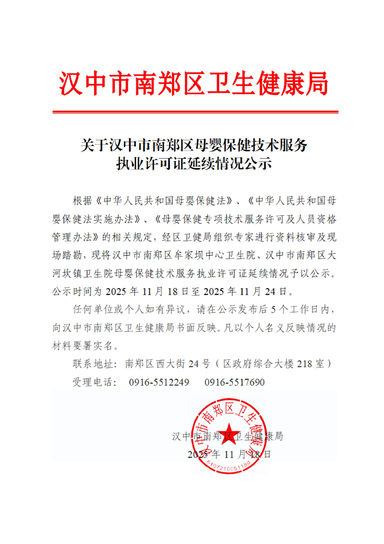 关于汉中市南郑区母婴保健技术服务职业许可证延续情况公示