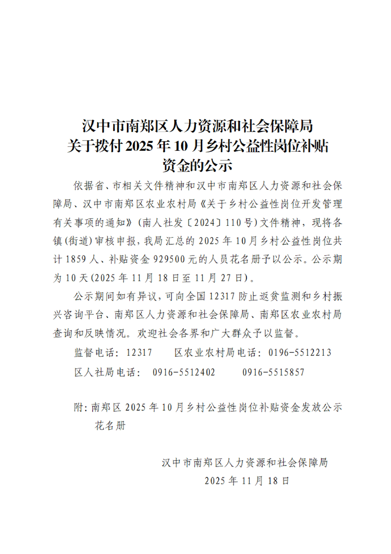 汉中市南郑区人力资源和社会保障局关于拨付2025年10月乡村公益性岗位补贴资金的公示