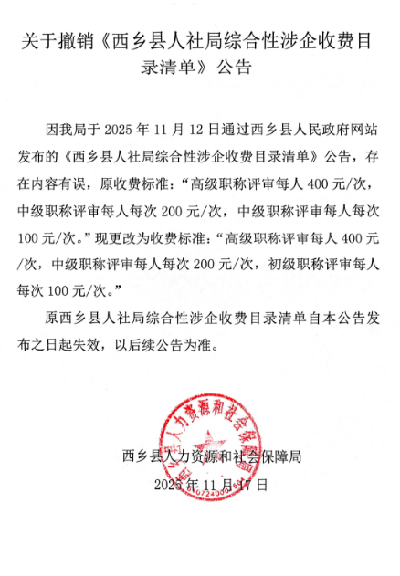 关于撤销《西乡县人社局综合性涉企收费目录清单》公告