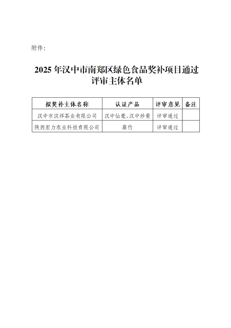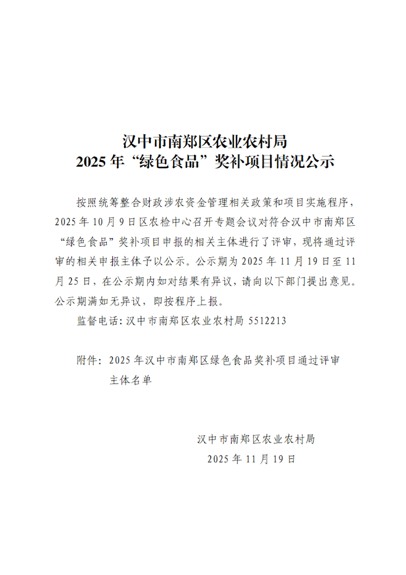 汉中市南郑区农业农村局2025年“绿色食品”奖补项目情况公示