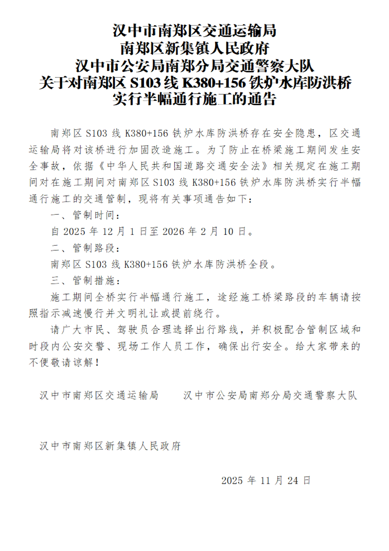 关于对南郑区S103线K380+156铁炉水库防洪桥实行半幅通行施工的通告