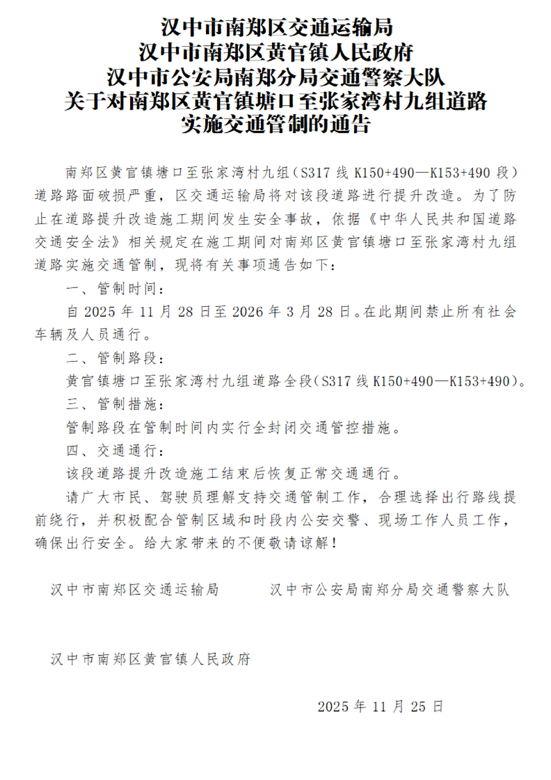关于对南郑区黄官镇塘口至张家湾村九组道路实施交通管制的通告