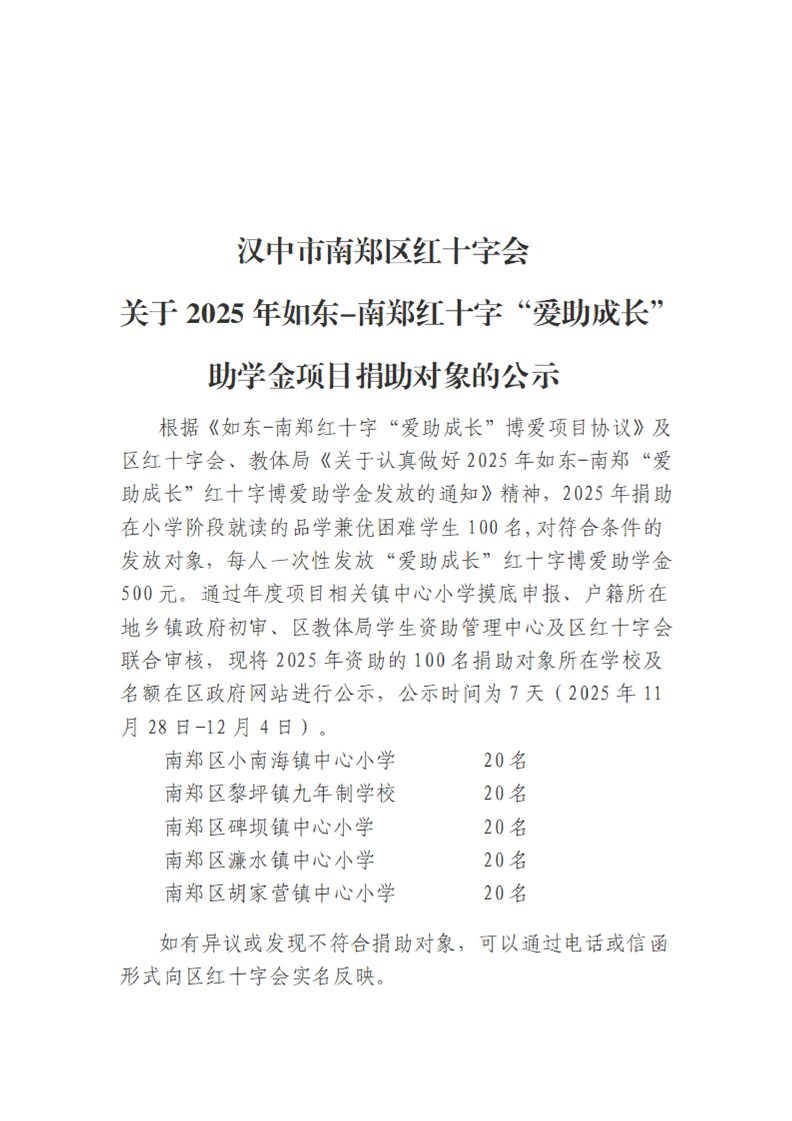 汉中市南郑区红十字会关于2025年如东-南郑红十字“爱助成长”助学金项目捐助对象的公示