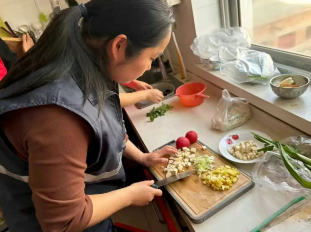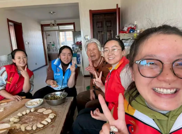 “宋奶奶,您看这饺子馅儿咋样?要是觉得淡,我再加点盐。”在农场社区独居老人宋学霞家中,党员志愿者吕丹和刘纯丽正手把手跟着老人学调馅儿,擀面杖滚动的声响与欢声笑语交织在一起。宋奶奶一边捏着饺子边儿,一边拉着志愿者的手念叨:“孩子们工作忙,平时我一个人吃饭总对付,今天你们来,家里热闹得像过年!”不一会儿,热腾腾的饺子出锅,志愿者们端着碗送到老人面前,看着老人吃得香,大家的脸上也露出了笑容。