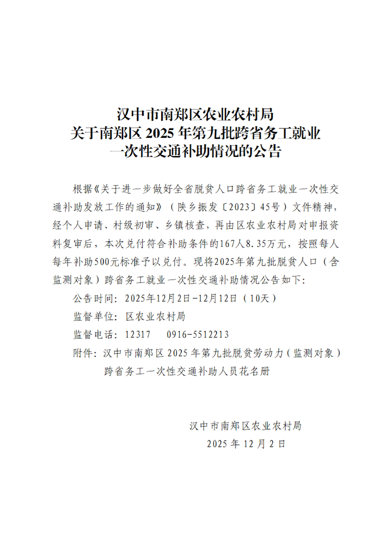 汉中市南郑区农业农村局关于南郑区2025年第九批跨省务工就业一次性交通补助情况的公告