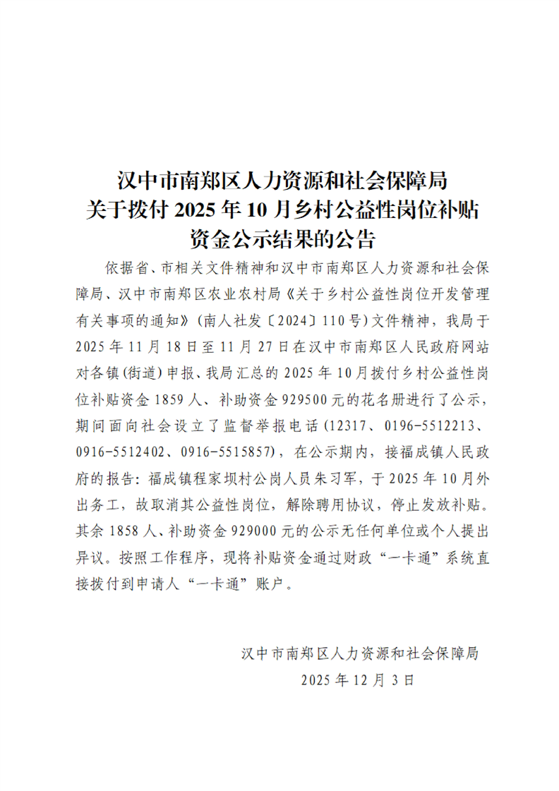 汉中市南郑区人力资源和社会保障局关于拨付2025年10月乡村公益性岗位补贴资金公示结果的公告
