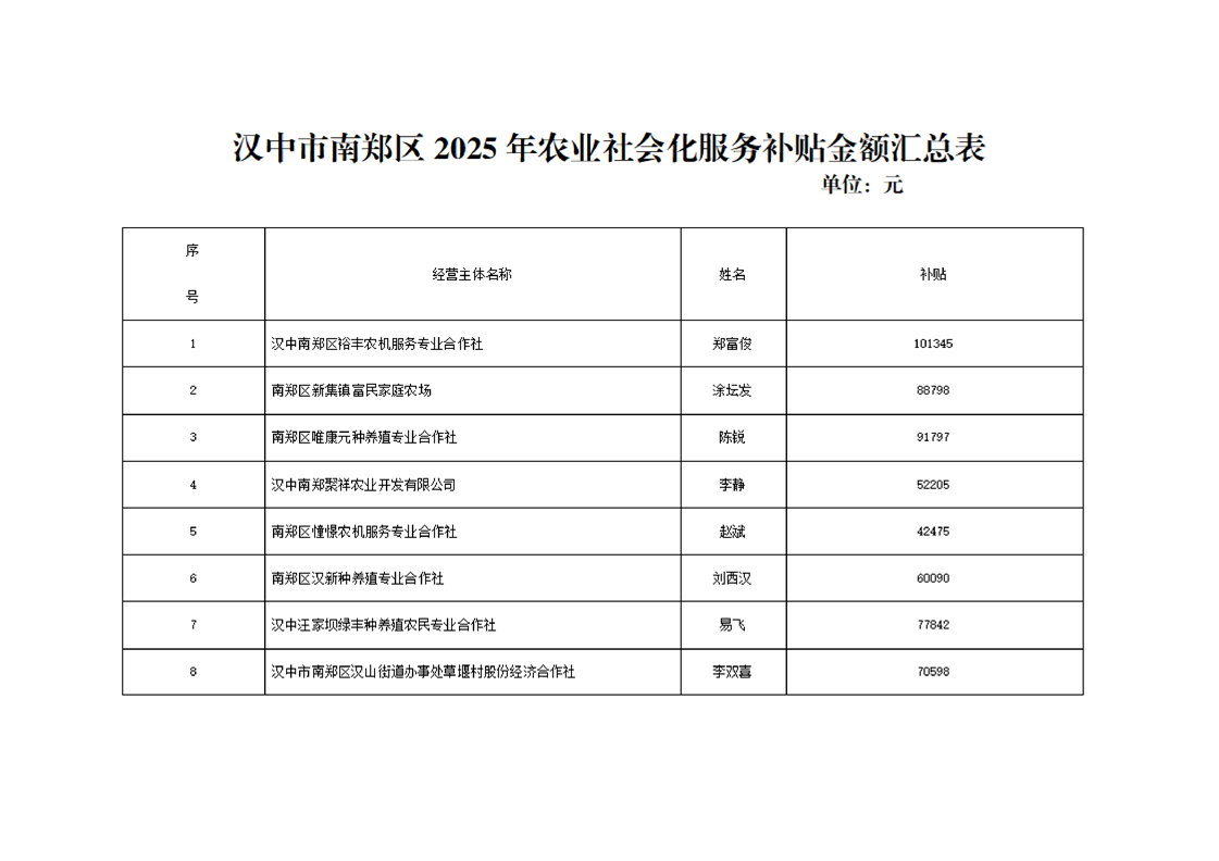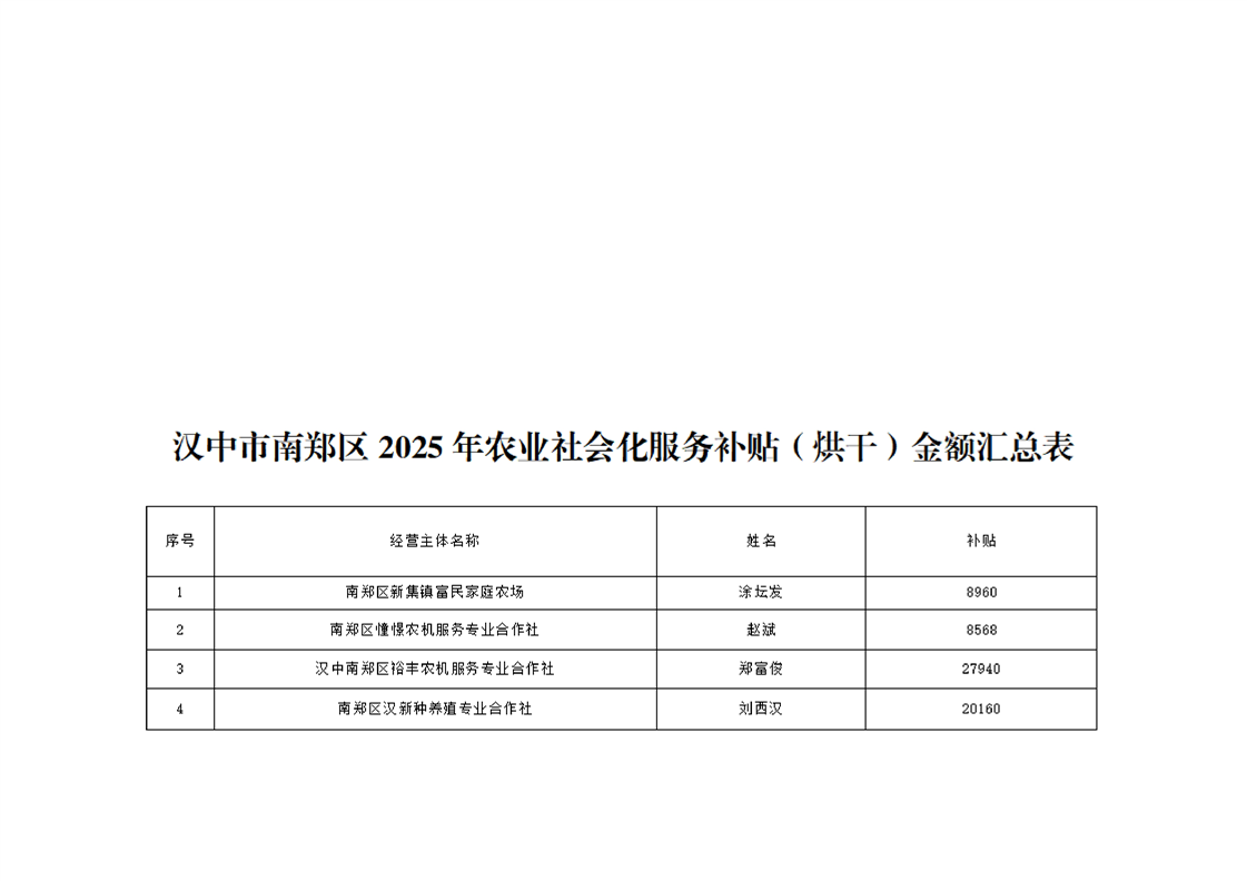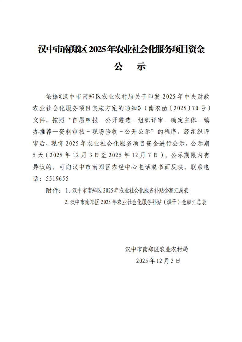 汉中市南郑区2025年农业社会化服务项目资金公示