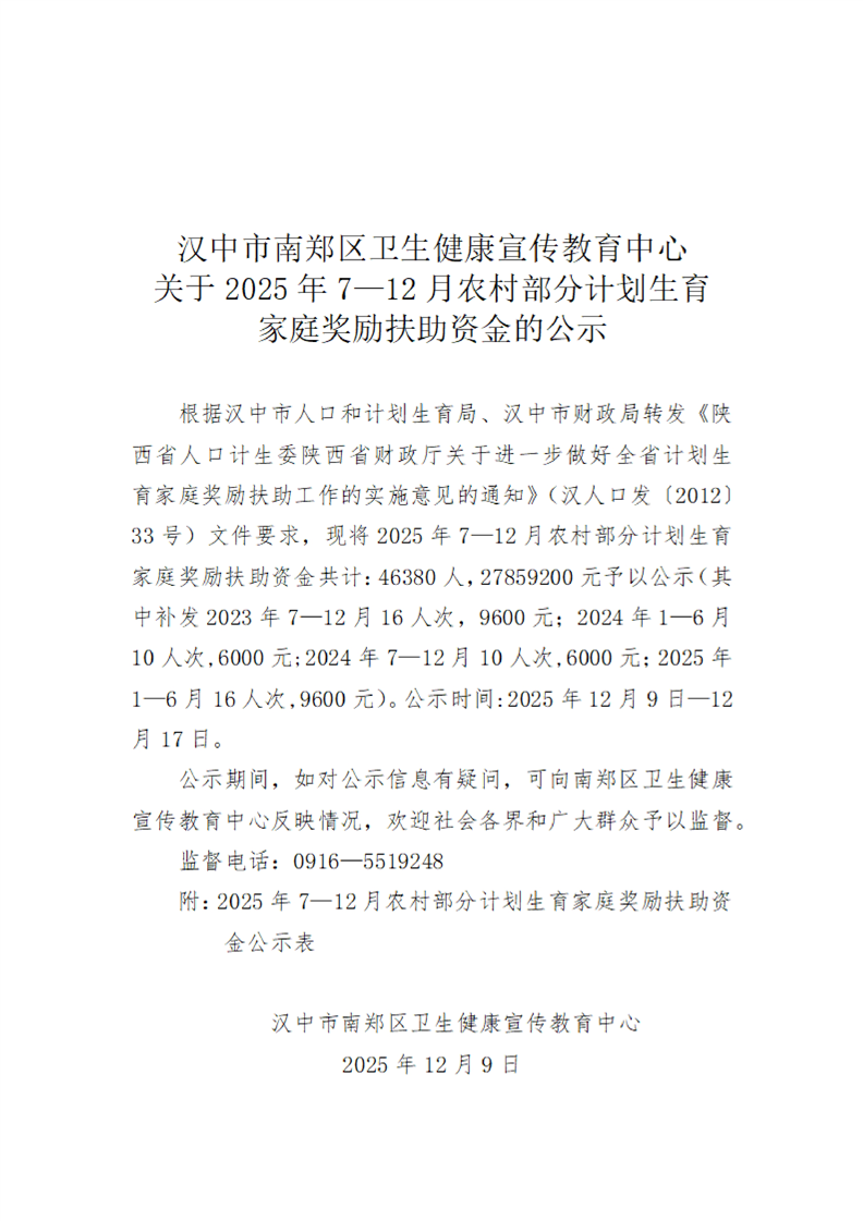 汉中市南郑区卫生健康宣传教育中心关于2025年7—12月农村部分计划生育家庭奖励扶助资金的公示