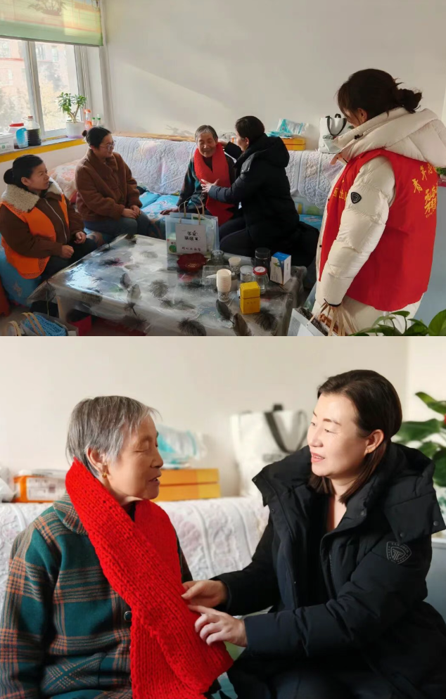 编织工作完成后,社区工作人员与“邻家嬢嬢”们分成多个小组,带着这些饱含爱心的围巾和精心准备的退烧药、创可贴、降压药等常用药品,逐一走访辖区内的独居老人、残疾人等困难群体家庭。在独居老人罗秀莲家中,志愿者们细心为老人戴上新围巾,详细询问老人的身体状况和生活需求,叮嘱老人注意冬季保暖、按时服药,并将常用药品的使用说明耐心讲解清楚。